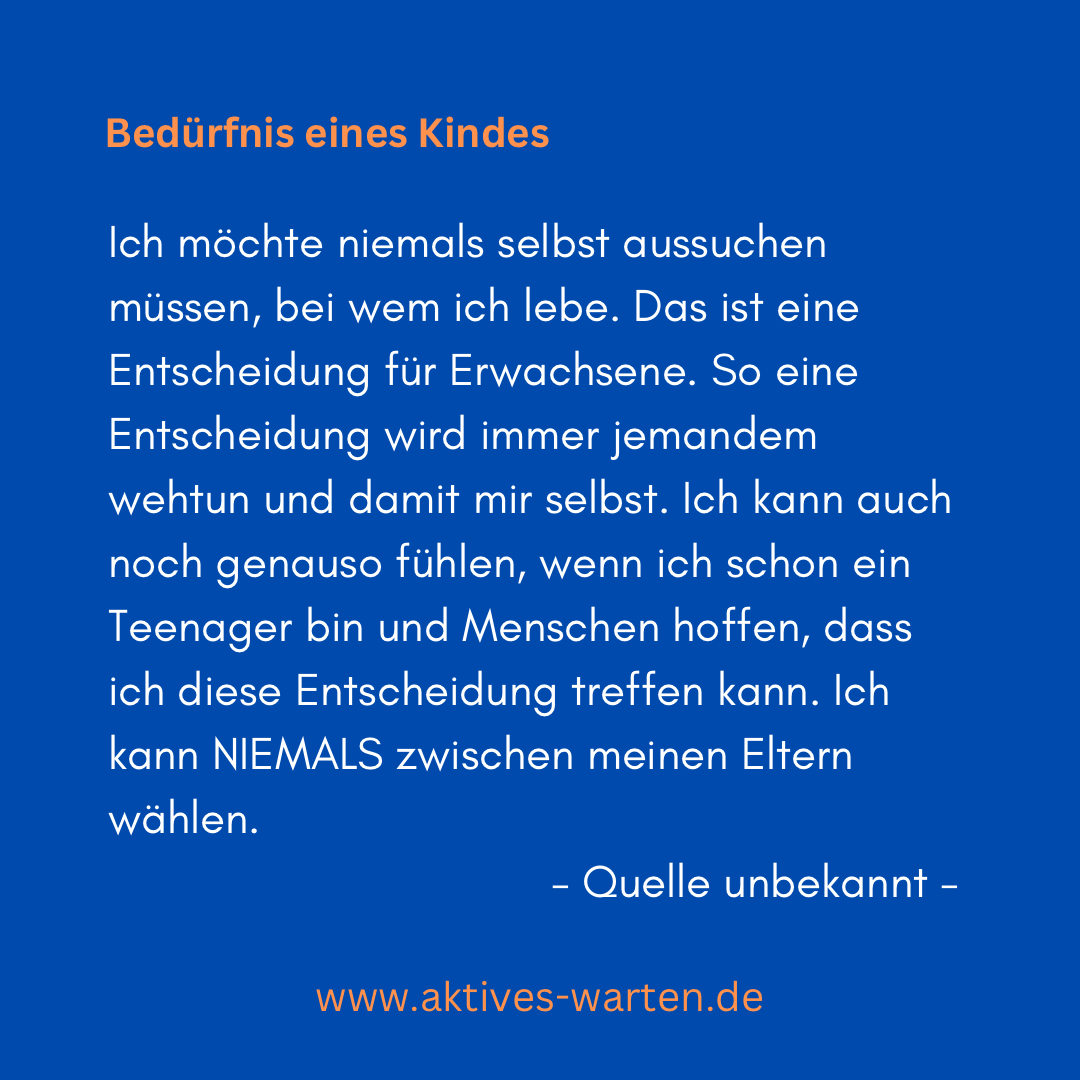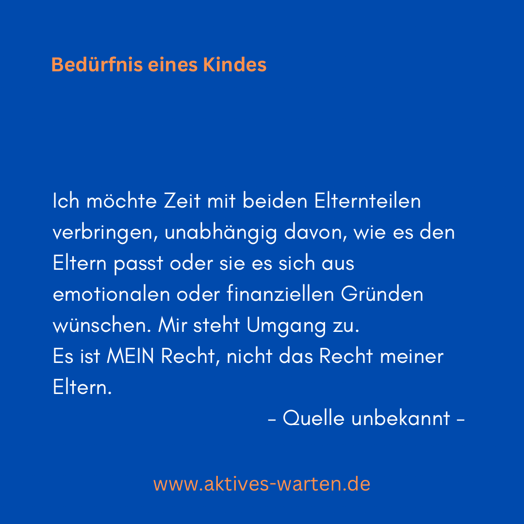 - Ich möchte Zeit mit beiden Elternteilen verbringen, unabhängig davon, wie es den Eltern passt oder sie es sich aus emotionalen oder finanziellen Gründen wünschen. Mir steht Umgang zu. Es ist MEIN Recht, nicht das Recht meiner Eltern.