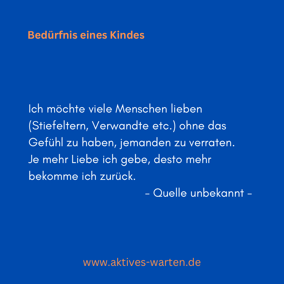- Ich möchte viele Menschen lieben (Stiefeltern, Verwandte etc.) ohne das Gefühl zu haben, jemanden zu verraten. Je mehr Liebe ich gebe, desto mehr bekomme ich zurück.